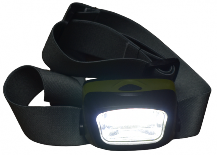 Lanterna montata direct pe frunte sau casca folosind curele speciale.
