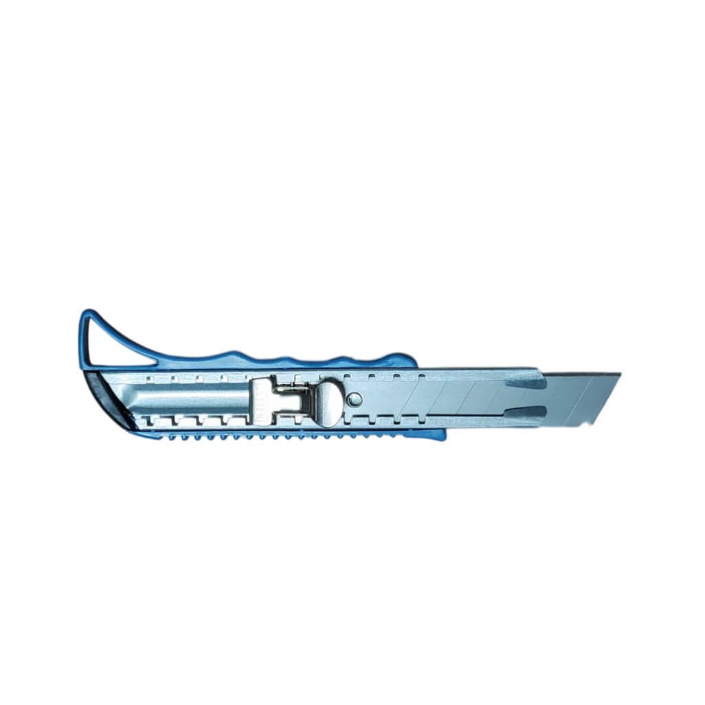 Cutter profesional cu lamă retractabilă, corp metalic și mâner ergonomic antiderapant. Include 3 lame de rezervă. Ideal pentru tăiere carton, folie, plastic și materiale ușoare.